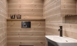 Våre hytter med hems er romslige og fleksible familiehytter med åpne allrom, store vindusflater og et tradisjonelt uttrykk som glir naturlig inn i omgivelsene. Hovedplanet har gode soner for samvær, med god takhøyde i stuen og en åpen løsning mellom kjøkken og oppholdsrom.